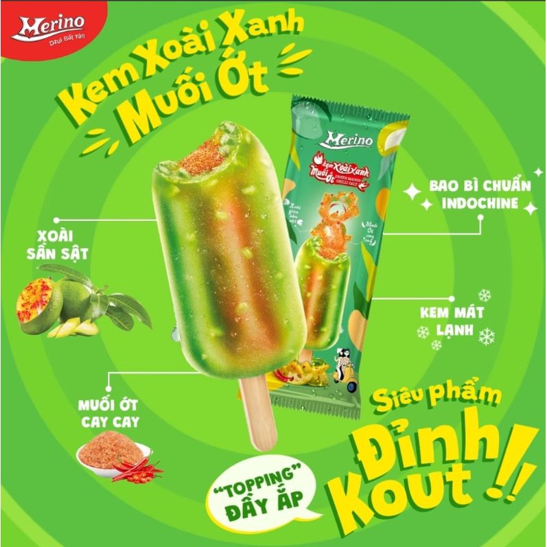 - Kem xoài Merino: Được yêu thích nhờ vị xoài tươi mát, kết hợp cùng chút muối ớt làm tăng thêm sự độc đáo cho sản phẩm.