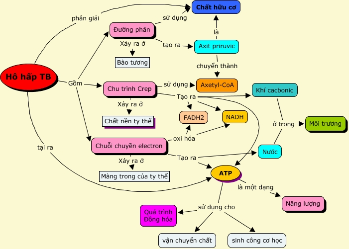 - Chu trình Crep: Còn gọi là chu trình axit citric, diễn ra trong ti thể. Axetyl-CoA từ quá trình đường phân tiếp tục bị phân giải thành CO2 và sản sinh NADH, FADH2 và một lượng nhỏ ATP.